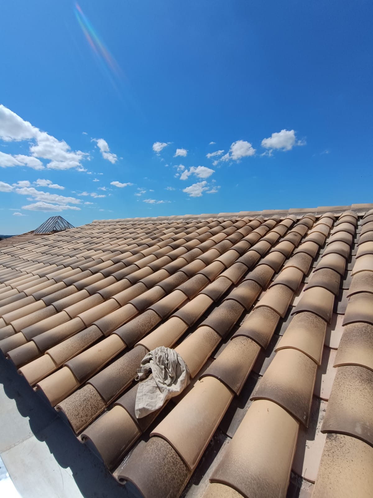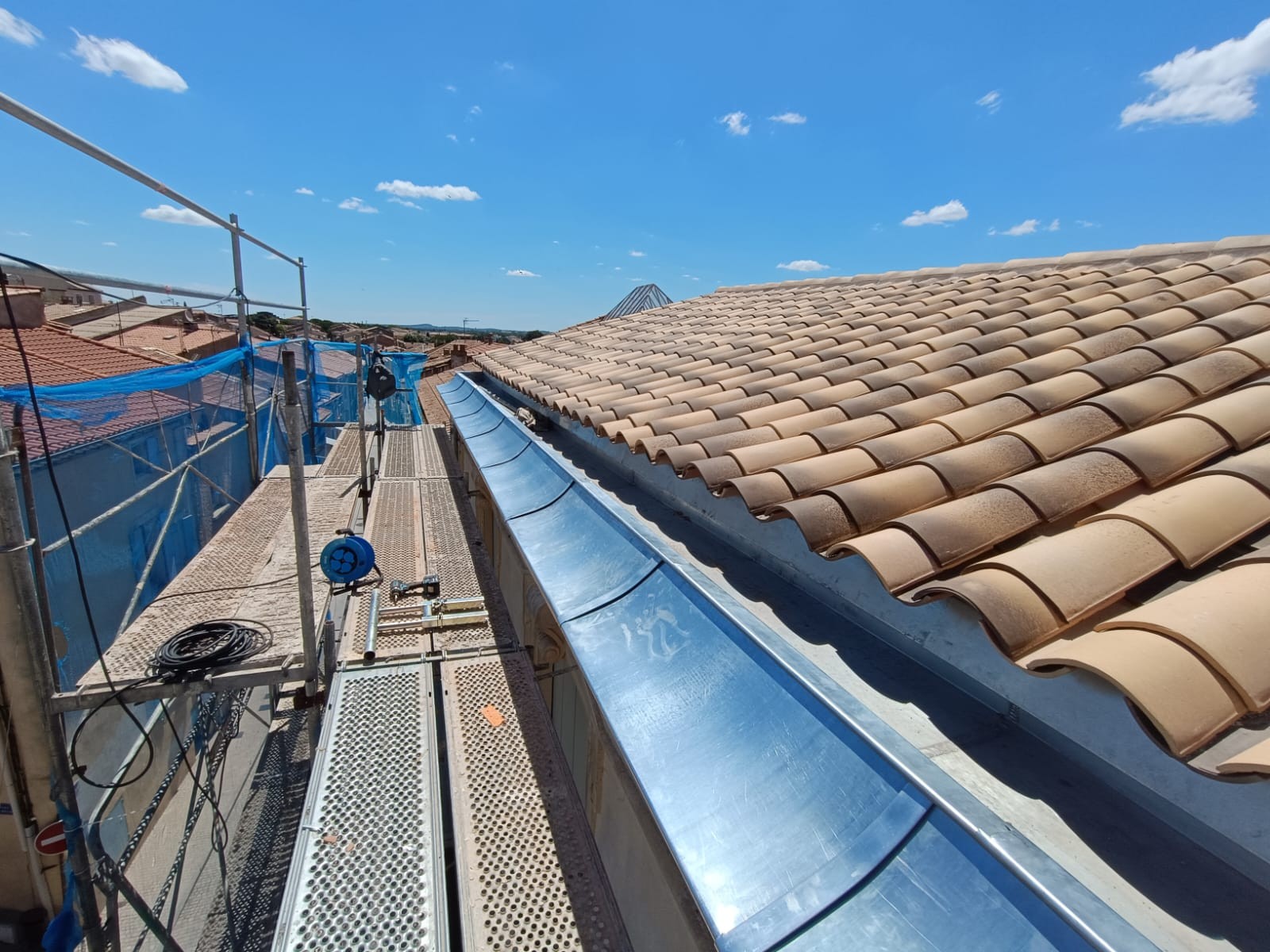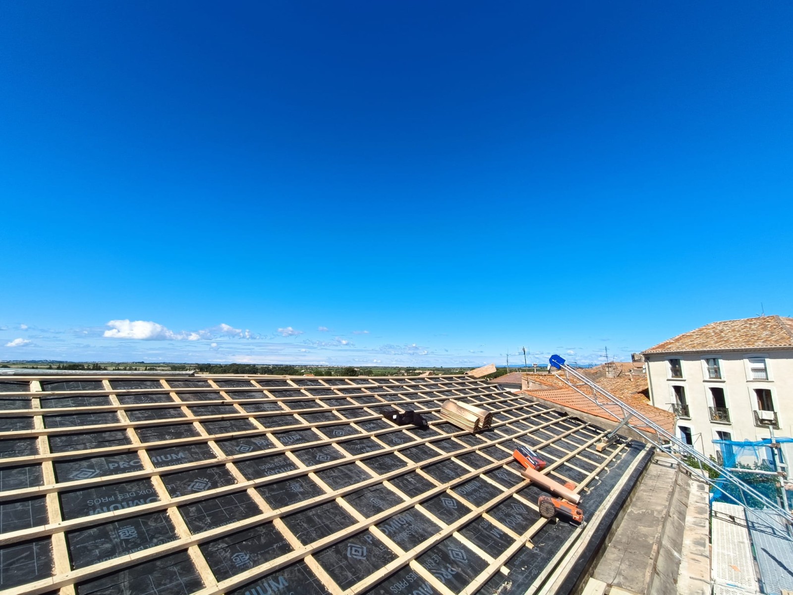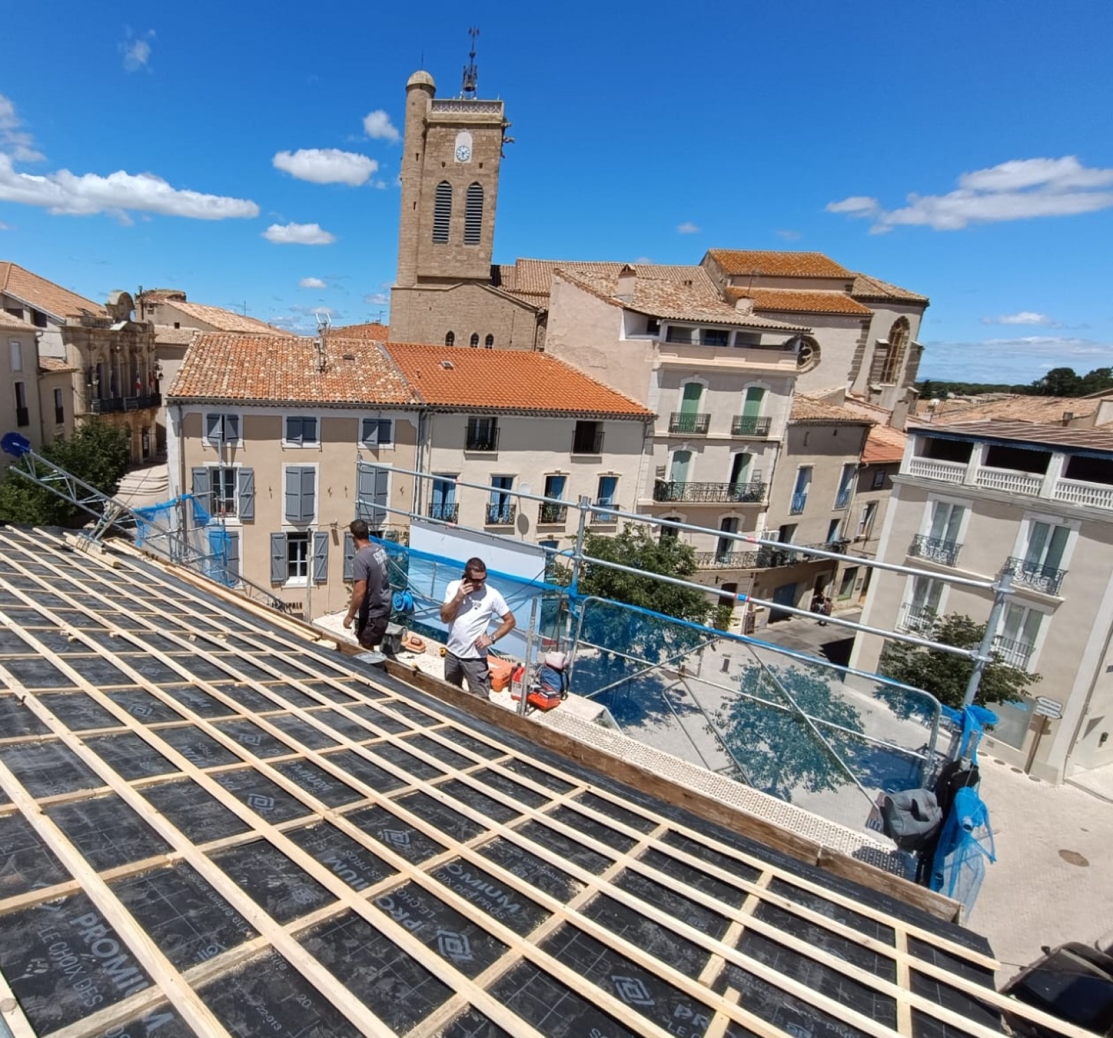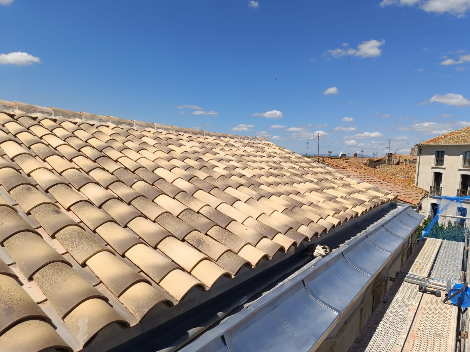 Réalisation d'une Rénovation de couverture dans le centre ville de Servian. Zone classée donc remise à l'identique de la couverture. Pose d'un écran sous toiture, tuiles canal à talons sur liteaux et chapeaux monier, midi du sud.