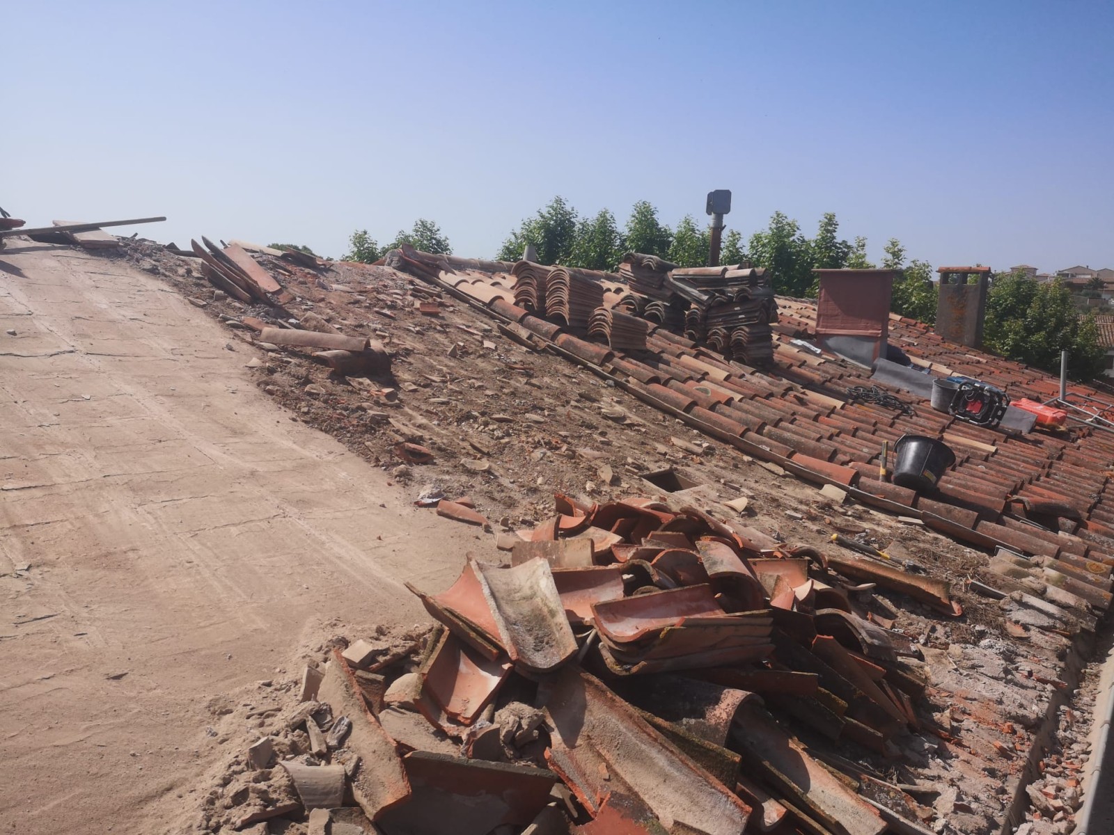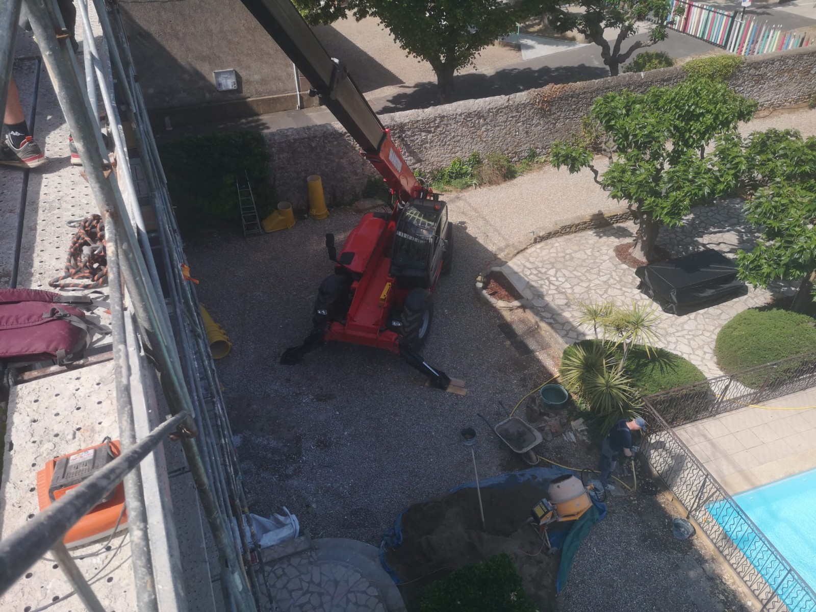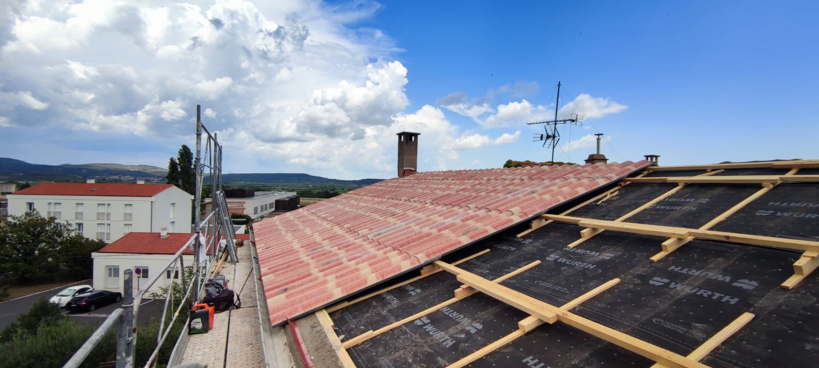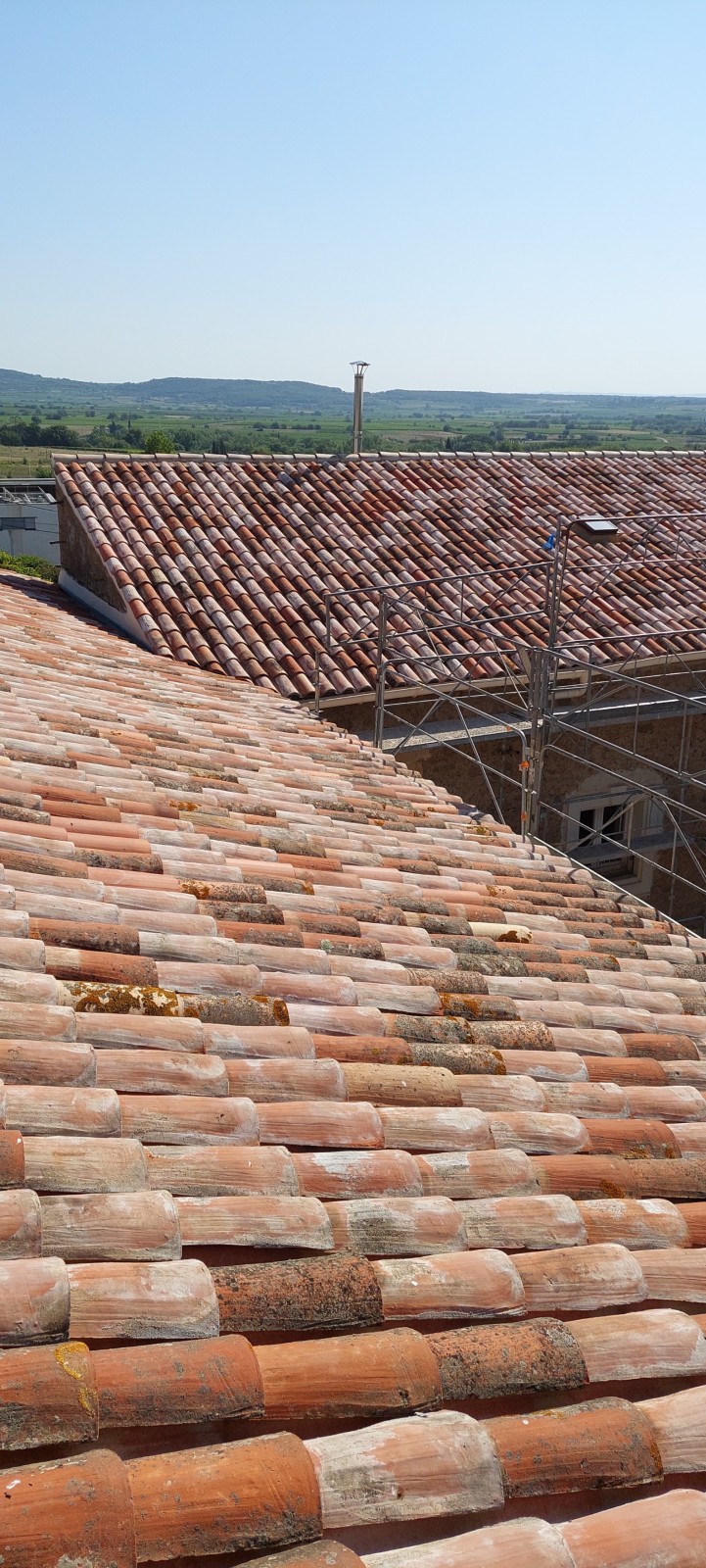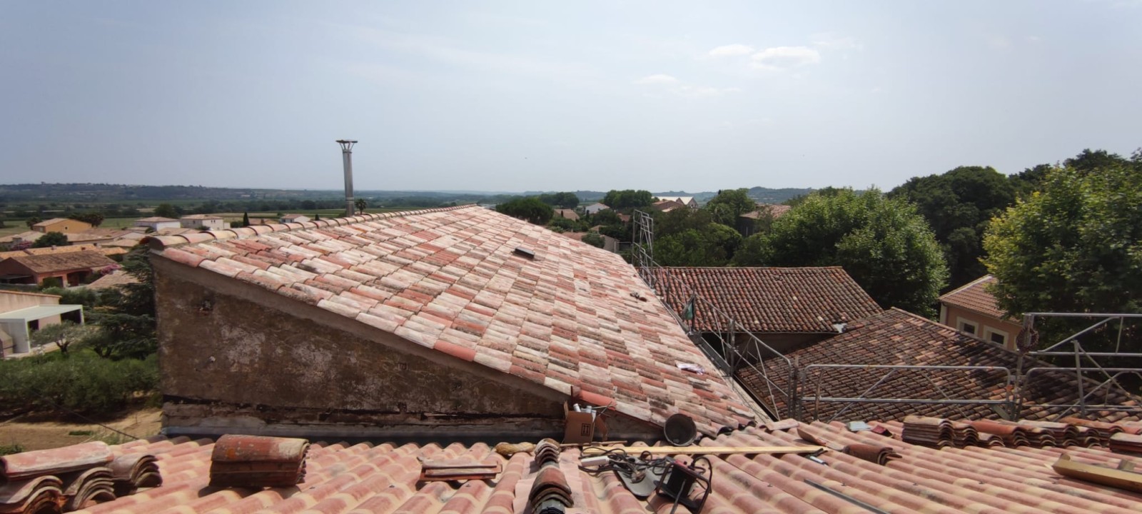 La société Évolution Toiture Servian est à Roujan village près de Servian pour la rénovation de la toiture de notre client. Dépose complète de la couverture en tuiles canal, des pare-feuilles. Nous avons supprimé les conduits de cheminée inutilisés, déroulé un écran sous-toiture pour travailler plus confortablement, en cas d'intempéries le temps de recouvrir la toiture. Nous avons redressé la charpente qui avait fléchi avec le temps puis refait les arases au mortier sur les murs extérieurs. Nous avons refait également le chéneau encaissé puis l'abergement de cheminée conservée en zinc. Le choix de la couverture, sur PST éternit pour recevoir la vieille tuile canal et conserver son aspect traditionnel. Le choix de la couverture sur pst, est la solution la plus rapide donc la plus économique.