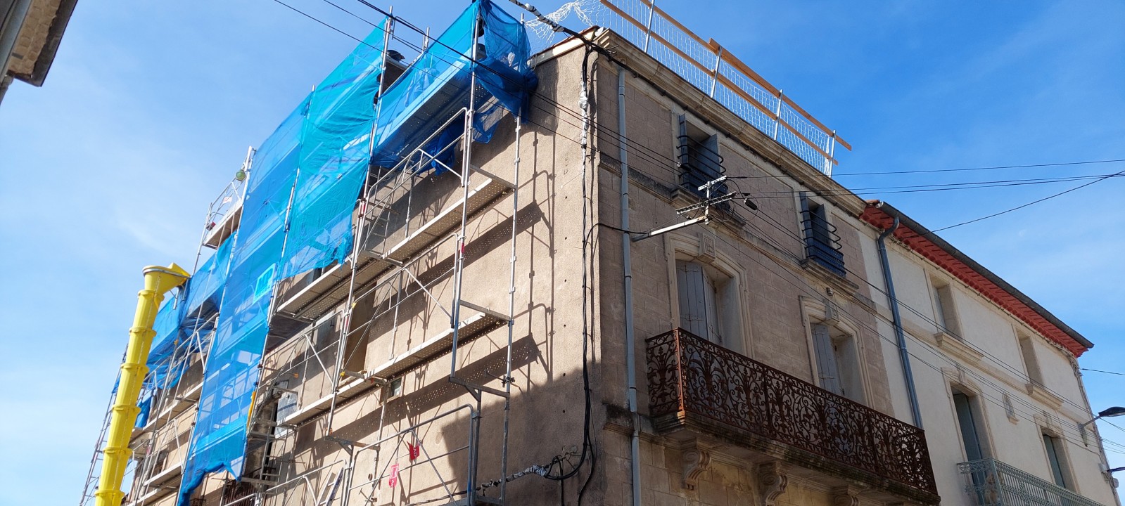 Réalisation d'une Rénovation de couverture dans le centre ville de Montagnac. Zone classée donc remise à l'identique de la couverture. Pose d'un écran sous toiture, tuiles canal à talons sur liteaux et chapeaux monier silvacane.